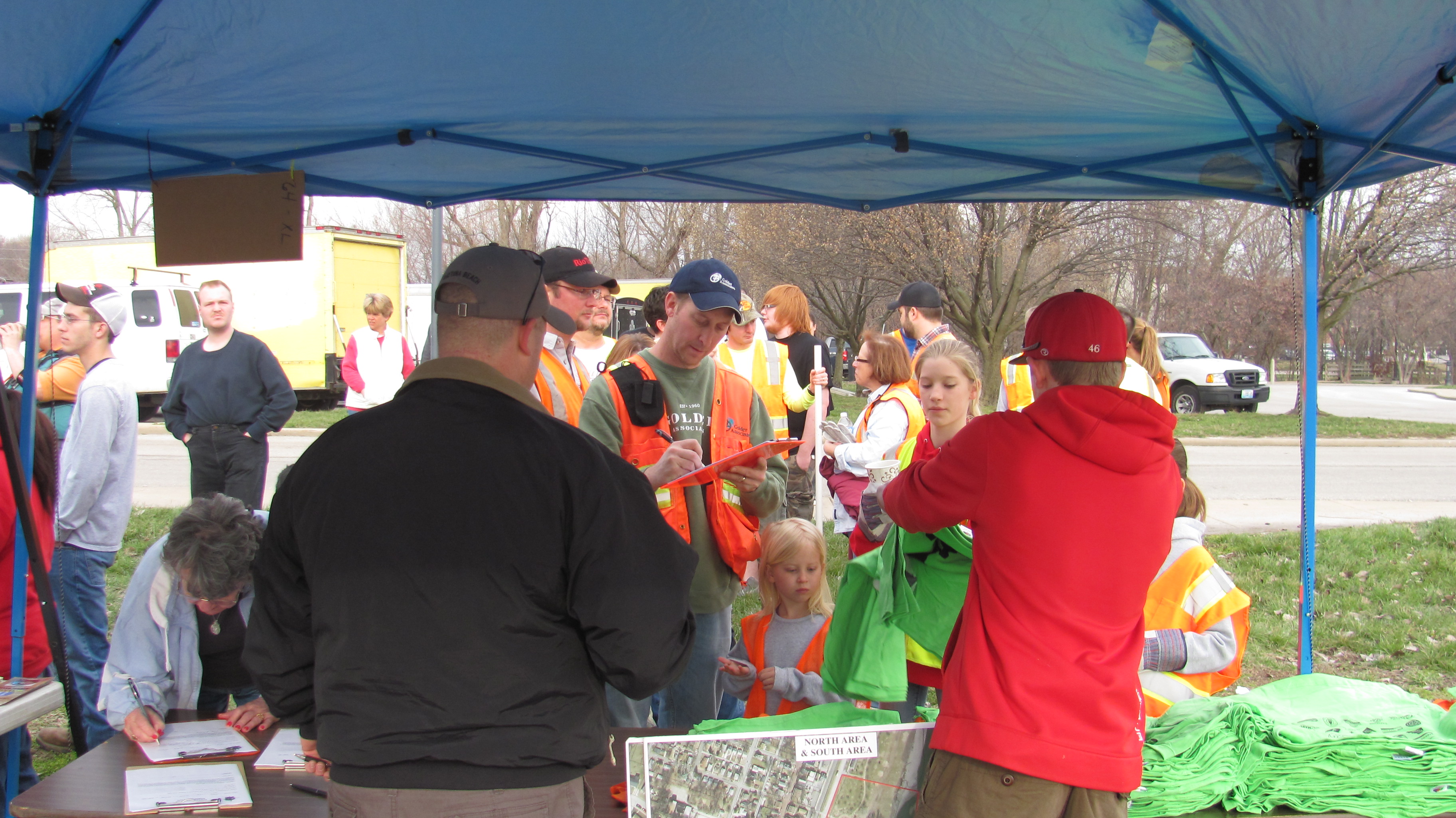 The registration area is one of the first things to get set up.  At the same time others are taking gear down the boat ramp, such as life jackets and water coolers, and boat captains are getting their boats ready.   It is important to erect the registration area right away.  There are always volunteers showing up early and, although we don’t start registering people early, at least they know where they need to be and are able to wait patiently until we are set up and ready to go.  At registration the volunteers decide if they want to clean up on land, or if they want to go out in the boats.  The pick up a colorful t-shirt, work gloves and a reusable bottle for water.