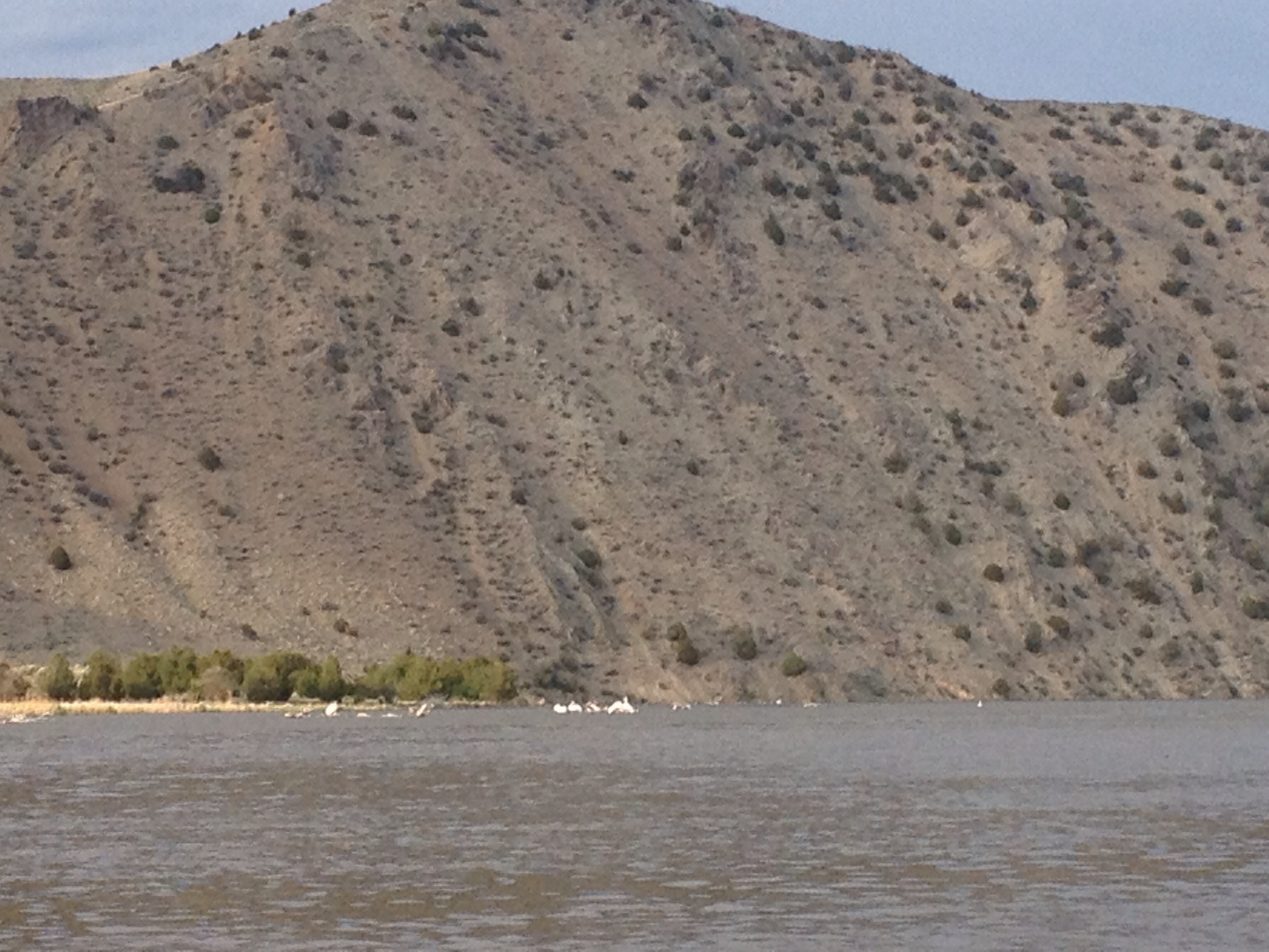 I thought I had lightened my load, but not sure.Getting ready to shove off at Three Forks, the Missouri River headwaters.We enjoyed incredible scenery all along the way. We were happy girls!Beautiful cliffsThe train was fun to watch as it rolled right along lake’s edge.My beloved pelicans bring me a peaceful easy feeling whenever they’re around. We saw about six people silhouetted standing on top of one of these mountains. We imagined how intimidating the Blackfeet Indians must have been when lining the ridge tops.